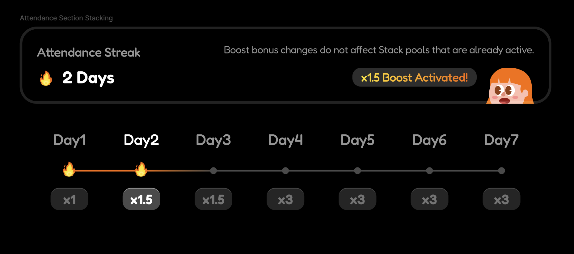 매일 와서 출석하면 보상이 쌓이는 속도가 부스터 효과를 받는 시스템